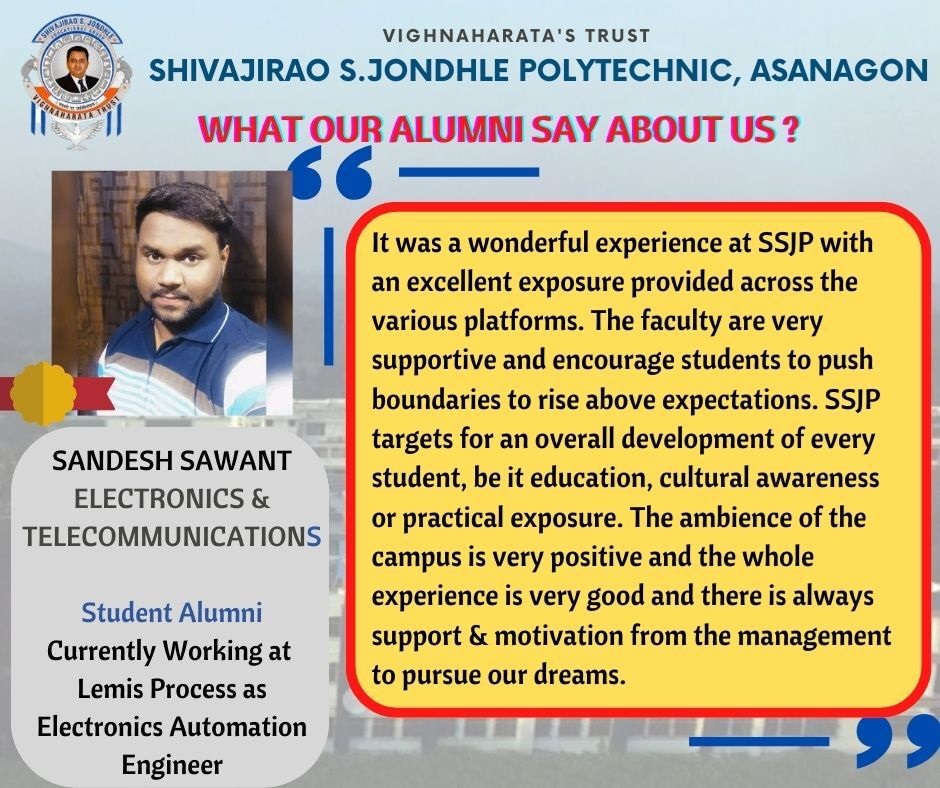 Shivajirao S. Jondhle Polytechnic, Asangaon established in the year 2007-08 and with the current intake capacity of 450 students in first and second shift. The institute is approved by AICTE, New Delhi; Recognized by DTE, Government of Maharashtra and Affiliated to MSBTE, Mumbai.